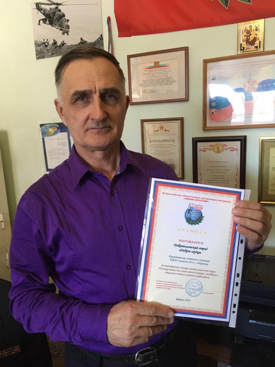 Каждый участник акции получил от руководителя Хабаровского краевого отделения «БОЕВОГО БРАТСТВА» Евгения Смышникова грамоту за волонтерскую помощь.