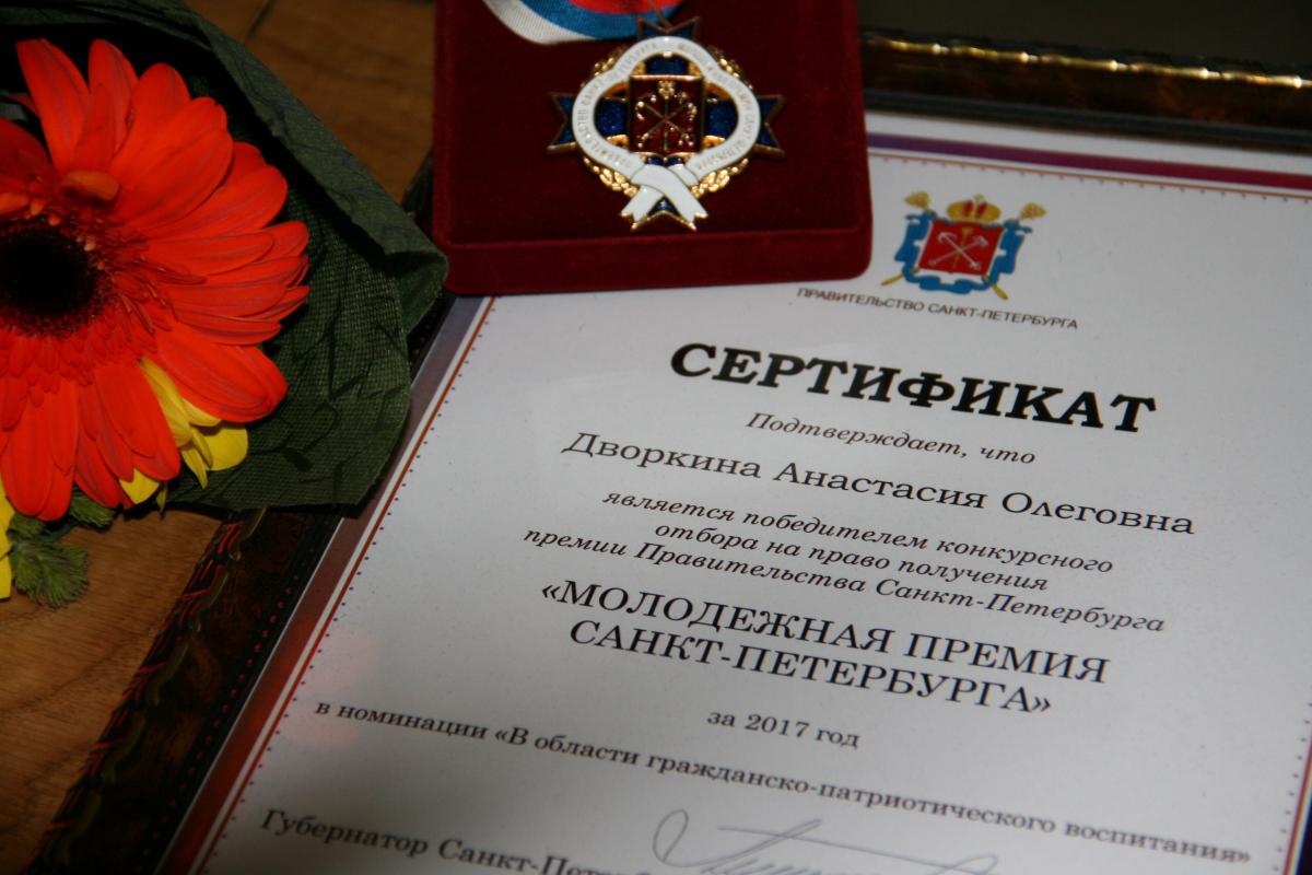 В Шереметьевском дворце 26 апреля состоялась торжественная церемония награждения лауреатов Молодежной премии правительства Санкт-Петербурга. В номинации «В области гражданско-патриотического воспитания» лауреатом стала член Санкт-Петербургского городского отделения Всероссийской общественной организации ветеранов «БОЕВОЕ БРАТСТВО» Анастасия Дворкина. Награду и сертификат с подписью губернатора Санкт-Петербурга Г.С. Полтавченко вручили вице-губернатор города, член Санкт-Петербургского городского отделения «БОЕВОГО БРАТСТВА» Константин Серов и председатель Общественной палаты Нина Кукурузова.