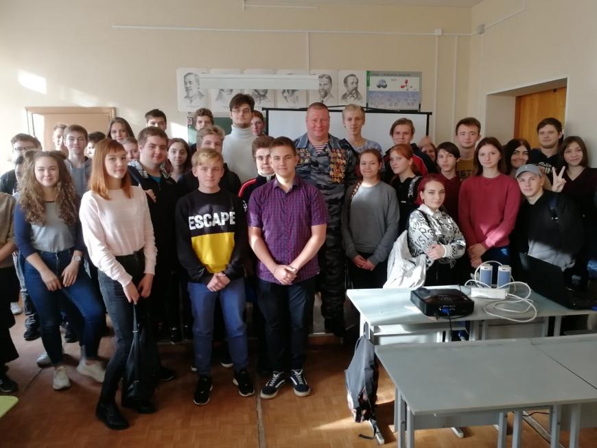 Председатель Совета Новгородского областного отделения «БОЕВОГО БРАТСТВА», ветеран боевых действий на Северном Кавказе Алексей Иванов 25 октября провел урок мужества в торгово-технологическом техникуме.