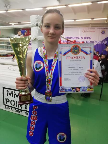 Во Владивостоке на рингах спортивного комплекса «Олимпиец» с 15 по 18 января проводился чемпионат и первенство ДФО по боксу среди женщин, юниорок и девушек. По итогам состязаний Дарья Буршина заняла 1-е место и получила кубок за лучший бой среди девушек в возрасте 13-14 лет.
