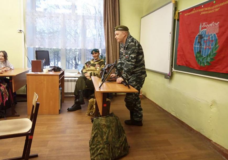 Ветераны боевых действий, представители Онежского отделения «БОЕВОГО БРАТСТВА» Евгений Кедрин, Евгений Леушин, Жигулин Павел, Василий Семенчук в преддверии празднования Дня защитника Отечества 17 февраля провели уроки мужества для учащихся 5-7-х классов средней школы №2, а так же 6-го класса средней школы №1 города Онеги Архангельской области.