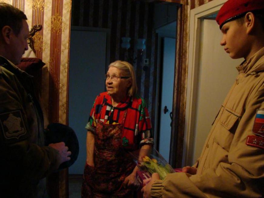 Юнармейцы Карелии со своими шефами из военного комиссариата республики, ветеранской организации «Патриот», и Карельского республиканского отделения Всероссийской общественной организации ветеранов «БОЕВОЕ БРАТСТВО» посетили участниц Великой Отечественной войны города Петрозаводска, а также матерей, чьи сыновья погибли, выполняя свой воинский долг в Афганистане и Чеченской республике, и поздравили их с наступающим праздником 8 марта.