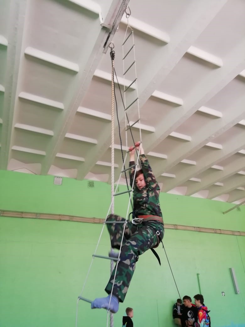 Они штурмовали высоту в спортивном зале школы при помощи верёвочной лестницы и двум параллельным верёвкам, именуемых параллельными перилами.