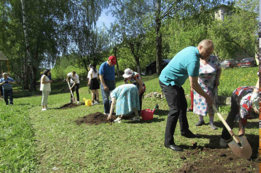 На территории района было высажено 20 саженцев яблонь и сирени. Высаженные саженцы станут настоящим украшением района и живой памятью о поколении победителей.
