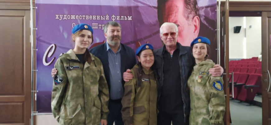 «На фото — слева направо - курсант Алина Матвеева. Рядом с Алиной стоит автор сценария, режиссёр и продюсер Олег Штром. А между Златой Григорьевой и Аришей Какашевой, исполнитель главной роли в фильме «С неба в бой» Михаил Жигалов», — рассказывают алтайцы. — «Огромное спасибо организаторам».