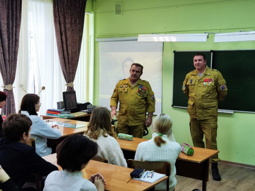 Занятие для восьмиклассников провели ветераны боевых действий, члены Волгоградского «БОЕВОГО БРАТСТВА» С. Гуляев и Н.Смирнов.