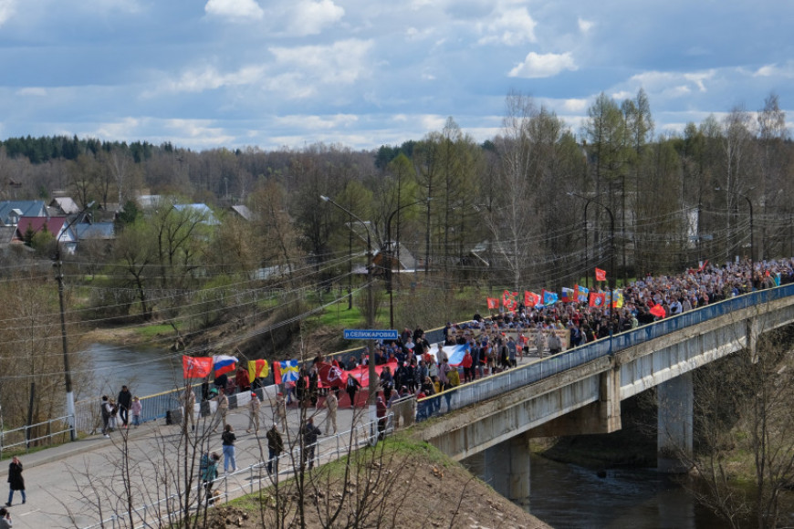 Колонна селижаровцев и гостей, приехавших к родным и близким в эти праздничные дни, растянулась на несколько сотен метров. В руках портреты тех, кто завоевал победу на фронтах Великой Отечественной, кто захоронен на просторах Европы, кто вернулся с фронта и восстанавливал народное хозяйство.