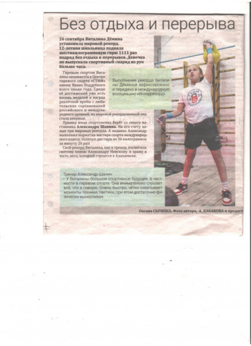 26 сентября воспитанница алапаевского ветерана Виталина Демина установила мировой рекорд — подняла шестикилограммовую гирю 1 111 раз подряд.