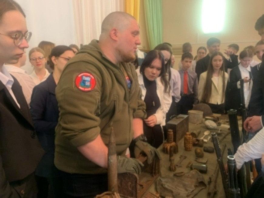 Ребята ознакомились с деятельностью поисковых отрядов, основная задача которых состоит в поиске солдат и офицеров, погибших в годы Великой Отечественной войны, и установление их судеб. Также для учеников была развернута выставка предметов, найденных во время проведения военно-археологических экспедиций, и макеты стрелкового вооружения Великой Отечественной войны.