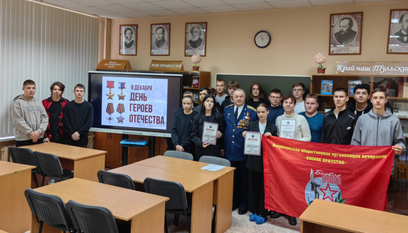 В День Героев Отечества ветераны «БОЕВОГО БРАТСТВА» Центрального и Зареченского районов Тулы Владислав Гайнулин, Андрей Кизиев, Вячеслав Горшков, Петр Найденов и Игорь Новиков провели семь уроков мужества для студентов тульских медицинского, сельскохозяйственного, экономического, юридического, машиностроительного колледжей, а также колледжа строительства и отраслевых технологий, участниками которых стали 410 студентов.