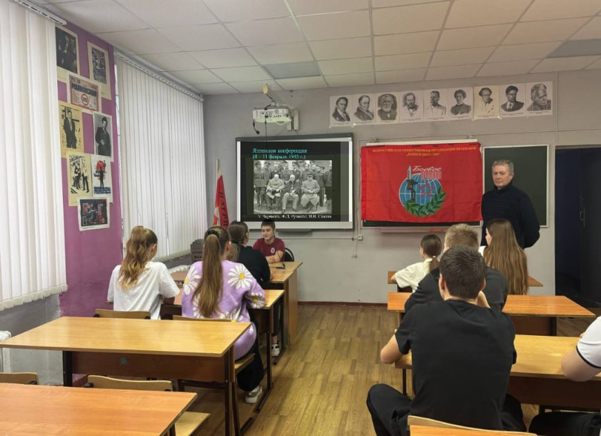 Член районного, имени кавалера ордена Красной звезды Константина Емельянова, отделения «БОЕВОГО БРАТСТВА» Андрей Подобедов рассказал ученикам о руководителях делегаций стран, принимавших участие в конференции. По документальным кадрам обучающиеся узнали о послевоенном устройстве Германии.