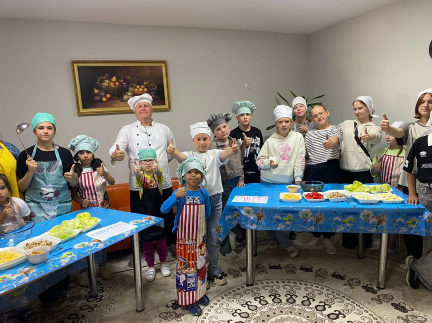 Во второй части урока провёл мастер-класс по изготовлению пельменей, пирогов. Рассказал о том, как добровольцы, находящиеся в гуманитарной ротации, коллективно готовят горячие питание для жителей дальних населенных пунктов ДНР И ЛНР, где после военных действий идут восстановительные действия для мирной жизни.