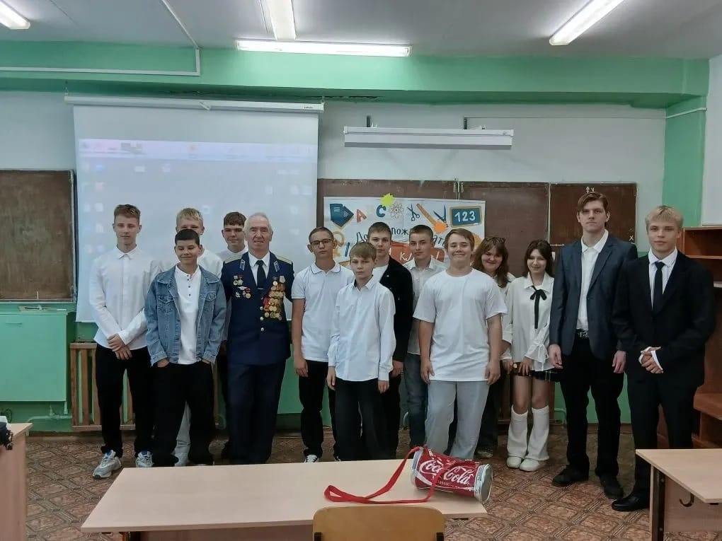 После торжественной линейки Олег Корниенко провел урок мужества с учениками 9А класса в количестве 15 человек. Тема урока «Как стать защитником Отечества». Олег Корниенко рассказал на личном примере, как стать офицером и что для этого необходимо сделать. Он перечислил все рода и виды Вооруженных сил и имеющиеся для их укомплектования офицерами учебные заведения. После урока мужества посетили музей Сызранского отделения “БОЕВОГО БРАТСТВА», который находится в здании этой школы.