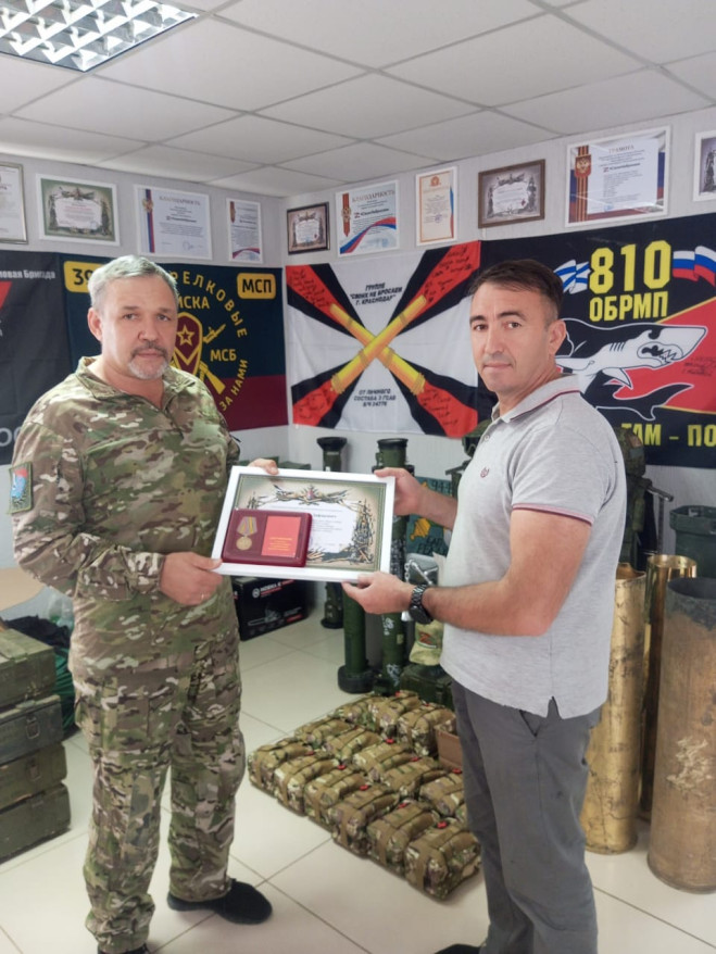 Вручил награды член ветеранской организации, волонтер Олег Бондарев. Награды вручены за неоднократную доставку гуманитарной помощи в зону проведения Специальной военной операции.