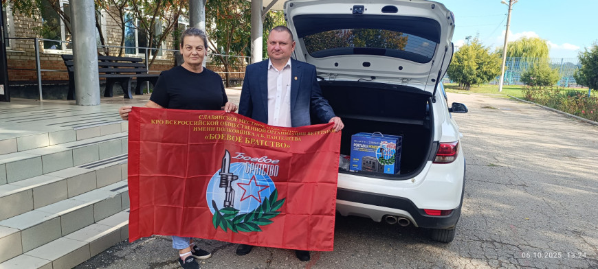 6 октября представители Славянского отделения «БОЕВОГО БРАТСТВА» имени полковника Александра Борисовича Пантелеева под руководством Александра Казуб передали зарядную станцию стоимостью 70000 рублей в одно из подразделений, выполняющее боевые задачи в зоне Специальной военной операции.