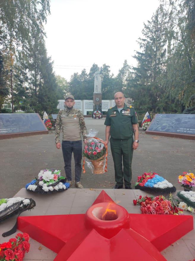 5 октября ветеран боевых действий, участник СВО, член Славянского местного отделения «БОЕВОГО БРАТСТВА» имени полковника А.Б. Пантелеева Денис Глыбин участвовал в возложении цветов у мемориального комплекса в честь героев Великой Отечественной войны в станице Анастасиевской.