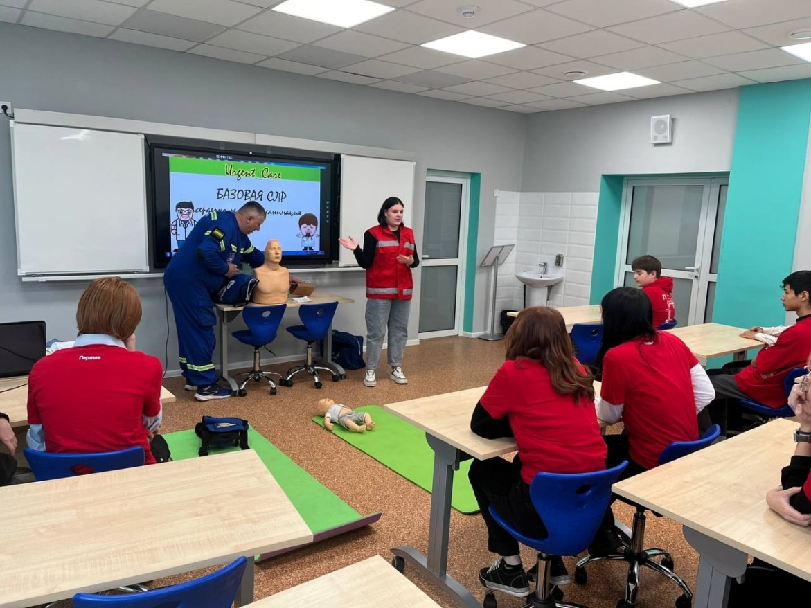 Во второй части прошло практическое занятие. Школьники закрепили основные действия на моделях. Детально разобрали алгоритм оказания первой помощи, в том числе при переломах и кровотечениях, правила сердечно-легочной реанимации.