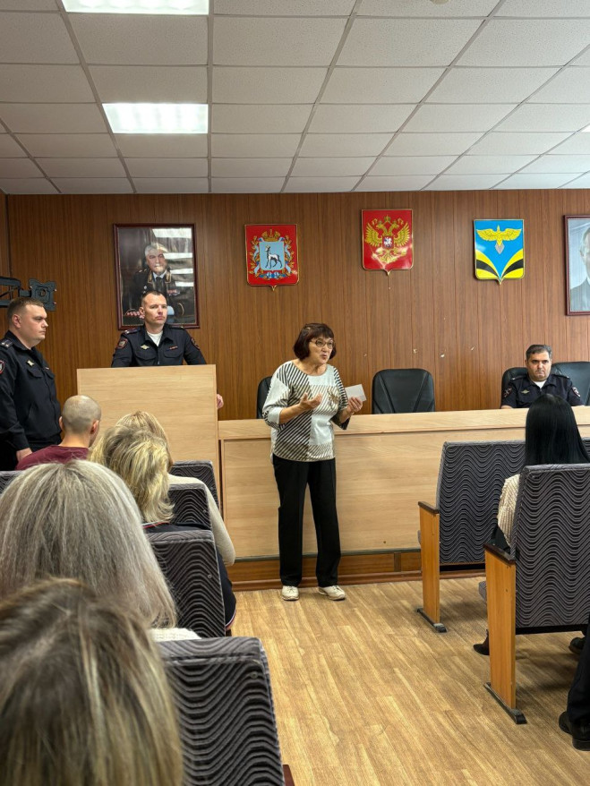 Она рассказала молодым полицейским о своей работе в милиции, о деятельности «БОЕВОГО БРАТСТВА», об уроках мужества со школьниками и сборах гуманитарной помощи для бойцов СВО.