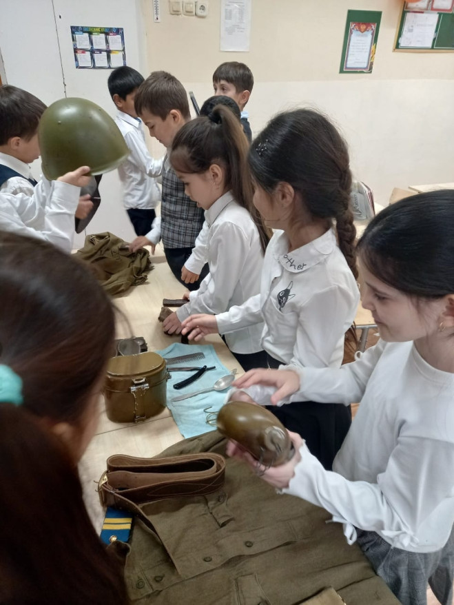 Школьники увидели, потрогали и даже примерили некоторые военные атрибуты.