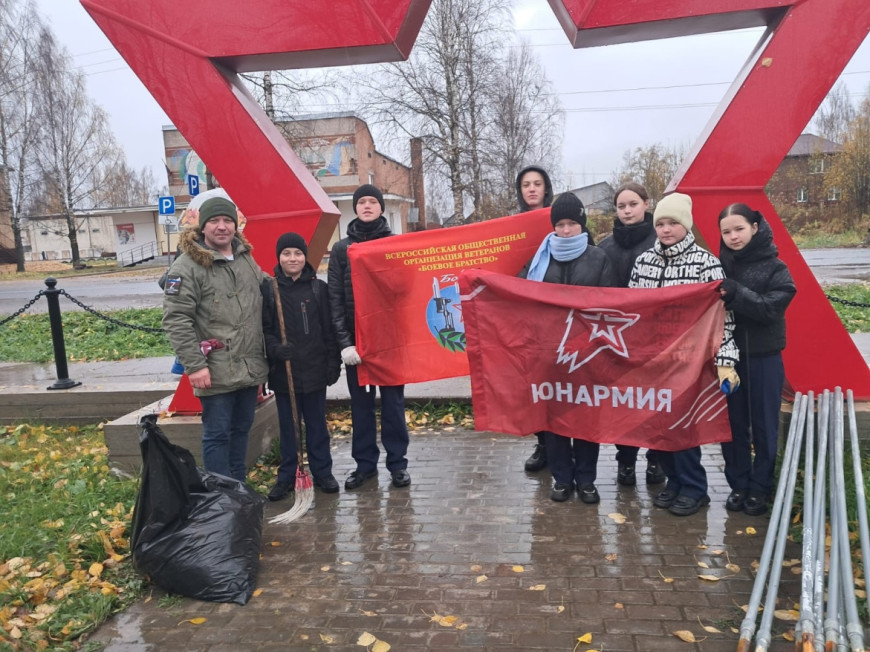 18 октября в поселке Плесецк ученики 7В класса средней школы вышли на осенний субботник у памятника ветеранам боевых действий.