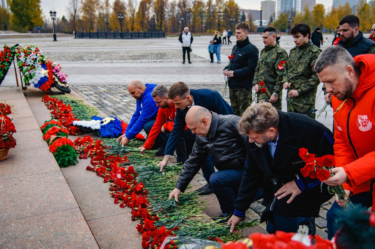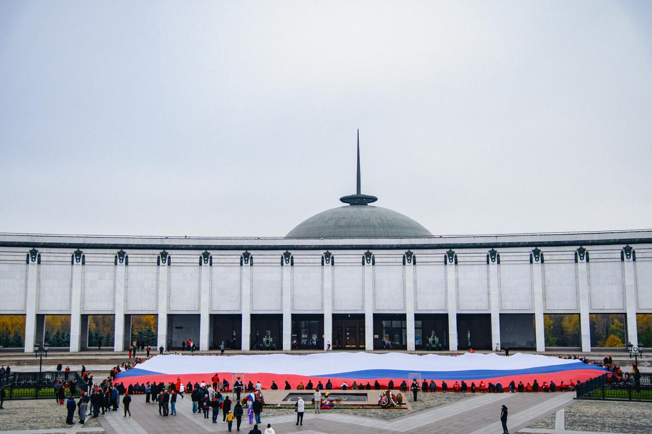 Представители Московского отделения «БОЕВОГО БРАТСТВА» и участники форума «Волонтёрской роты» возложили цветы к Вечному огню и растянули масштабную ленту-триколор 25х50 метров.