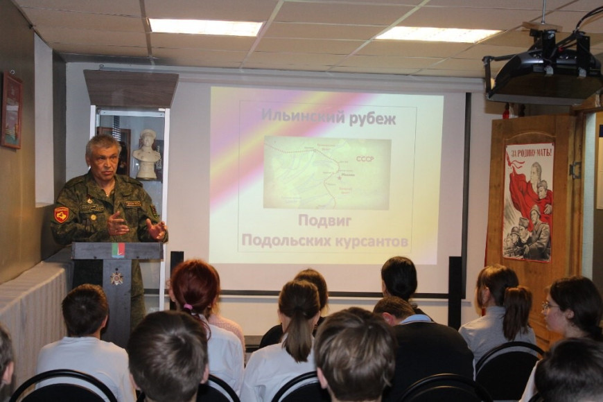 Тема урока - “Ильинский рубеж”. Ребятам рассказали о подвиге подольских курсантов.