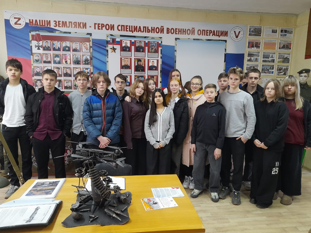 На уроке присутствовали 25 человек. Были раскрыты причины начала войн, рассказано о ходе проведения боевых действий в Калининской оборонительной и наступательной операциях, Афганской и Чеченских войнах, причины и ход проведения СВО. Школьники ознакомились с экспонатами, привезёнными из зоны СВО.