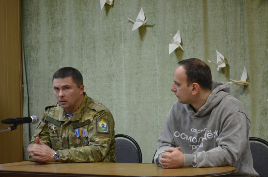 После студенты могли пообщаться с автором фильма, а также с гостем мероприятия — ветераном СВО, членом Ненецкого регионального отделения «БОЕВОГО БРАТСТВА» Тарасом Кропачевым. Ветеран поделился с ребятами и автором проекта впечатлениями от просмотра и рассказал истории из своего боевого опыта: как однажды чудом не наступил на мину-лепесток, как бойцы обустраивают свой быт в полевых условиях и том, как важна тем, кто находится на передовой, любая помощь, посылки из дома.