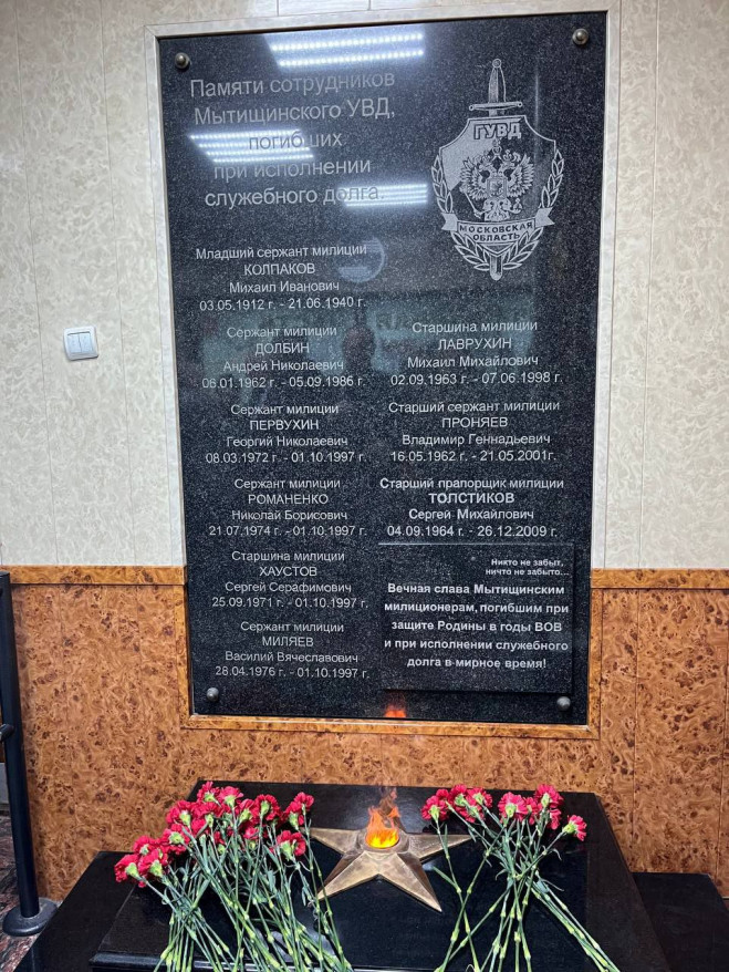 Собравшиеся возложили цветы к доске памяти погибших полицейских. Этот ритуал стал напоминанием о мужестве сотрудников правоохранительных органов, их самоотверженности, преданности служебному долгу и чести.