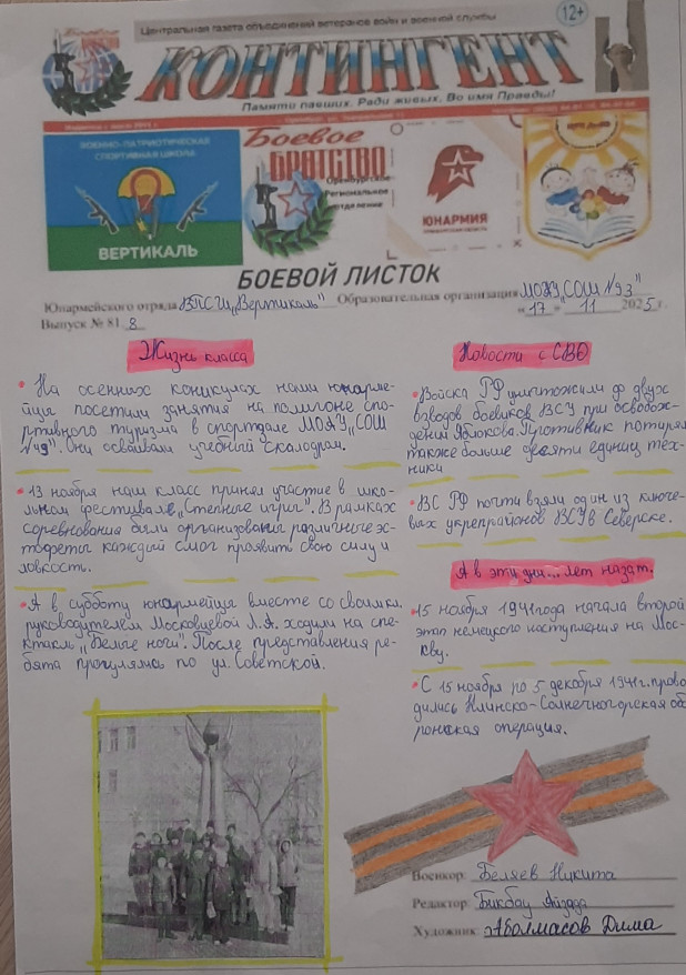 20 ноября вышли новые выпуски «Боевых листков» военно-патриотической спортивной школы «Вертикаль» Оренбургского регионального «БОЕВОГО БРАТСТВА». К конкурсу присоединился юнармейский отряд «Звезда» школы № 87 из Абдулина. Организовал мероприятия Член «БОЕВОГО БРАТСТВА» Леонид Колчинский.