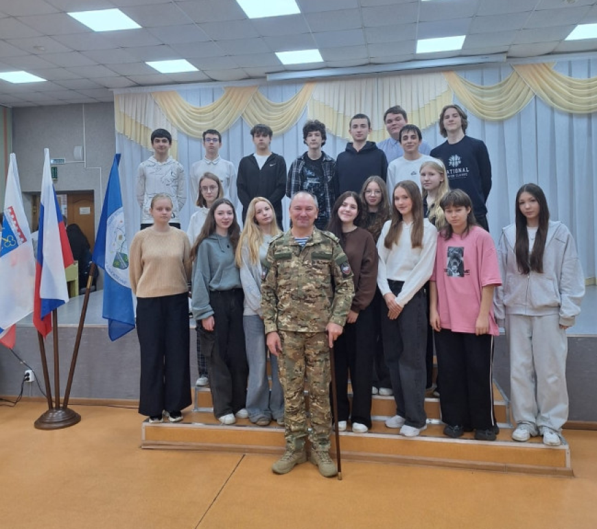 Встреча прошла в рамках проекта «Разговор о важном» для старшеклассников. Сергей Петраков, командир батальона, проходящий реабилитацию после ранения, рассказал школьникам о своем боевом опыте и дал напутственные слова.