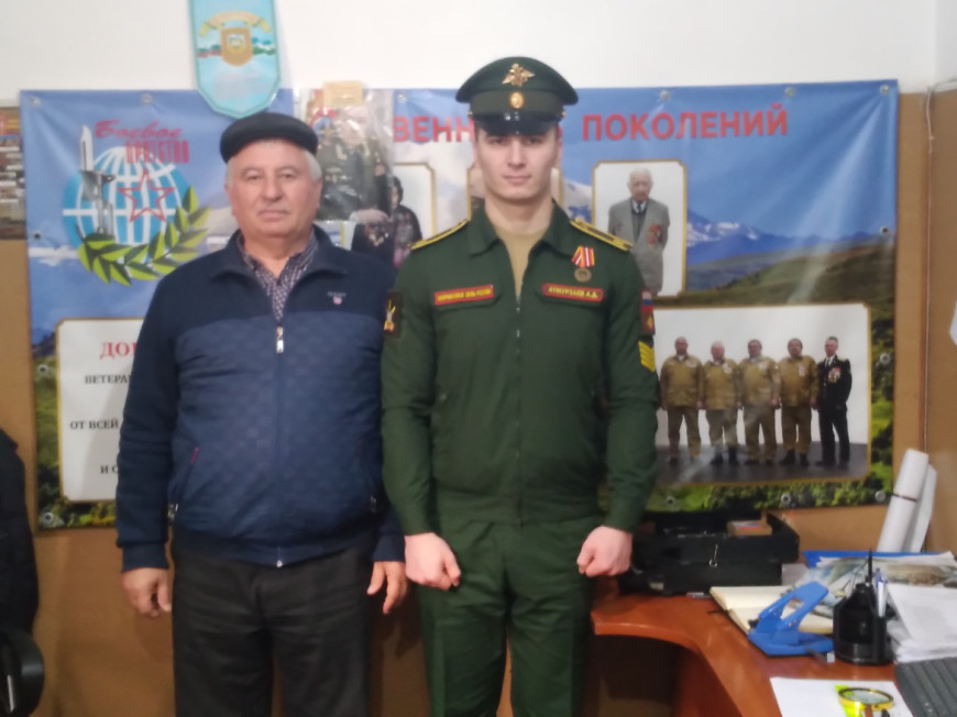 Во встрече участвовали ветераны «БОЕВОГО БРАТСТВА» Барасби Гелястанов и Хадис Мирзоев, а также курсант 4-го курса Михайловской военной артиллерийской академии Минобороны РФ Аслан Атмурзаев.
