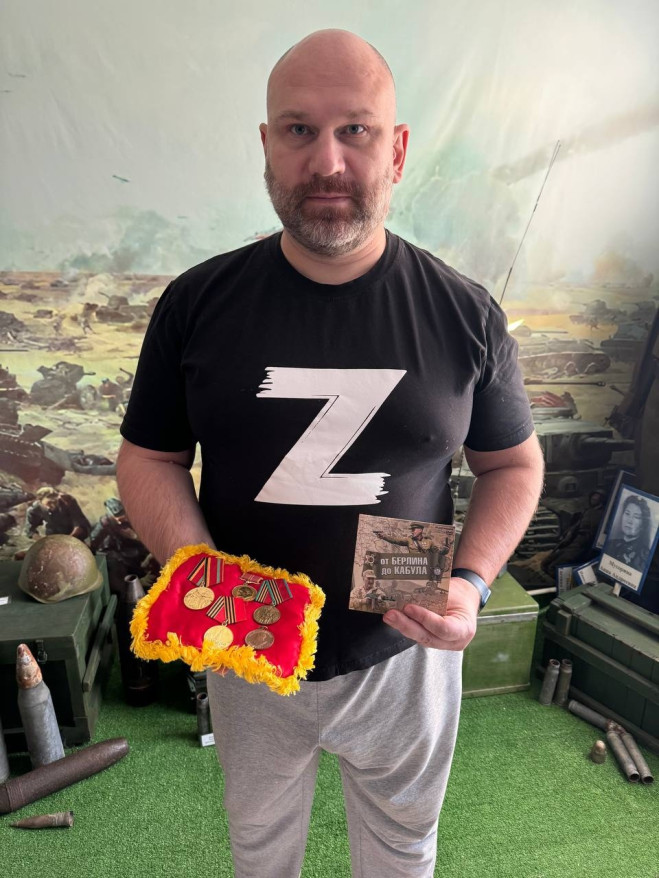 Член Сызранского «БОЕВОГО БРАТСТВА» Сергей Иванов передал медали участника Великой Отечественной войны и диск «От Берлина до Кабула» самарского военно-исторического клуба «Патриоты».