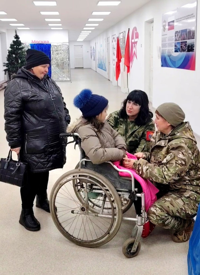 Елена и Майя передали две специальные инвалидные коляски для школьницы — домашнюю и уличную, а для учеников пятой школы Луганска — подарки от Тамбовского филиала Российского детского фонда.
