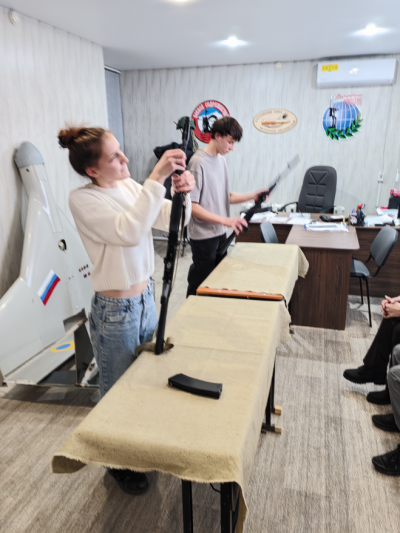 Ветеран рассказал о тактико-технических характеристиках автомата Калашникова и о том, что АК является основным стрелковым оружием нашей армии. После проведения инструкции по технике безопасности школьники начали разборку и сборку автомата.