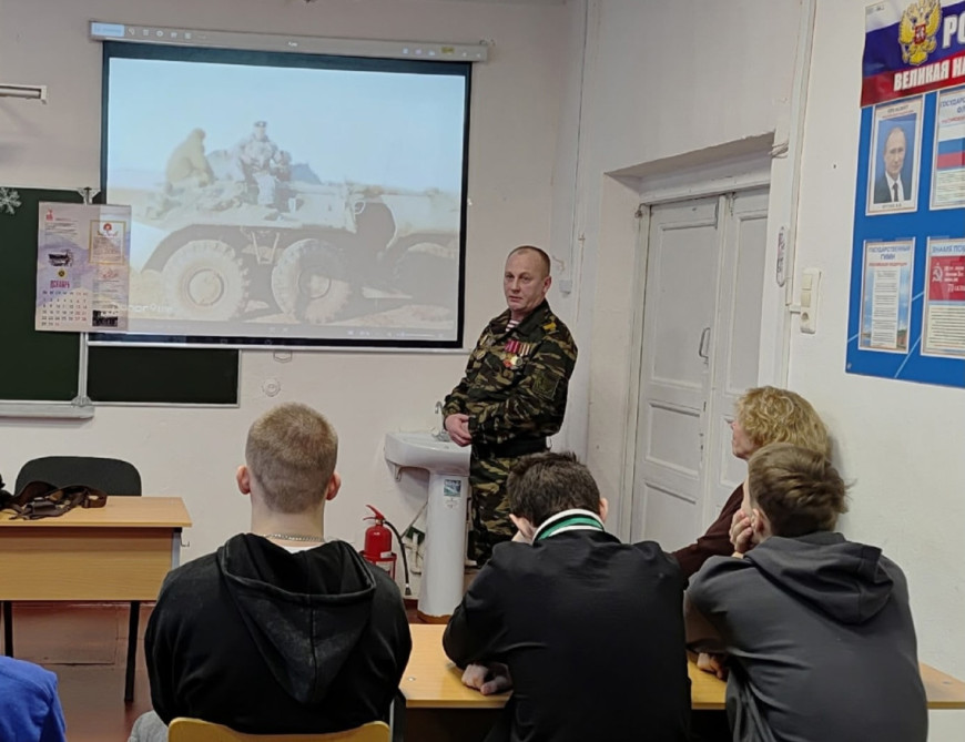 Занятие для 30 студентов провели члены Кадуйского районного отделения «БОЕВОГО БРАТСТВА». Ветераны боевых действий на Северном Кавказе Эдуард Васильков и Сергей Вологдин рассказали учащимся о своей службе в горячих точках.