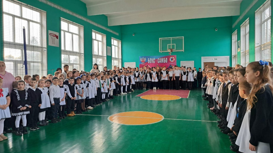 В спортивном зале собрались ученики 1-6-х классов, педагоги и почётный гость — атаман Старовеличковского казачьего общества, руководитель Калининского отделения «БОЕВОГО БРАТСТВА» Михаил Обмочий.