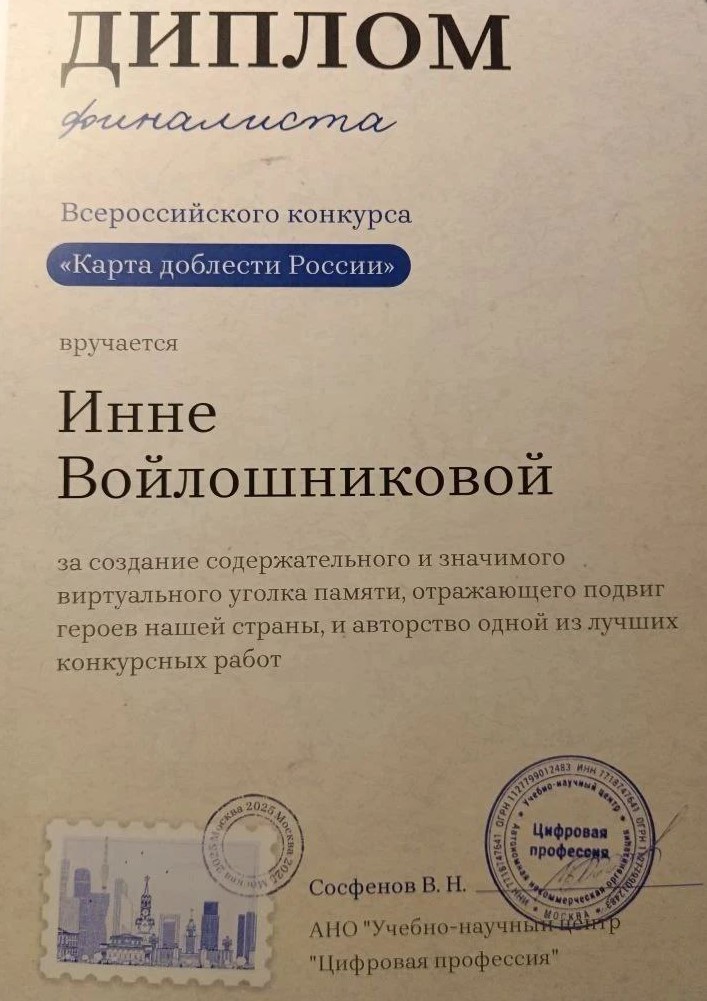 мотивацию к дальнейшему участию в патриотических проектах, расширение круга общения и обмена опытом с другими поисковыми отрядами. Итоги и перспективы: работа «Вахта Памяти 2025» вошла в ТОП‑50 лучших работ всероссийского конкурса, каждый участник отряда получил диплом финалиста, опыт участия будет использован для подготовки к следующим этапам «Карты доблести России» и иным конкурсам, отряд планирует продолжить поисковую работу и документировать её результаты в мультимедийных форматах. Память о героях живёт в делах, исследованиях и творчестве. Мы помним. Мы ищем. Мы сохраняем», — сказала член Внуковского отделения «БОЕВОГО БРАТСТВА», руководитель отряда «Пламя» Инна Войлошникова.